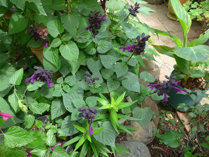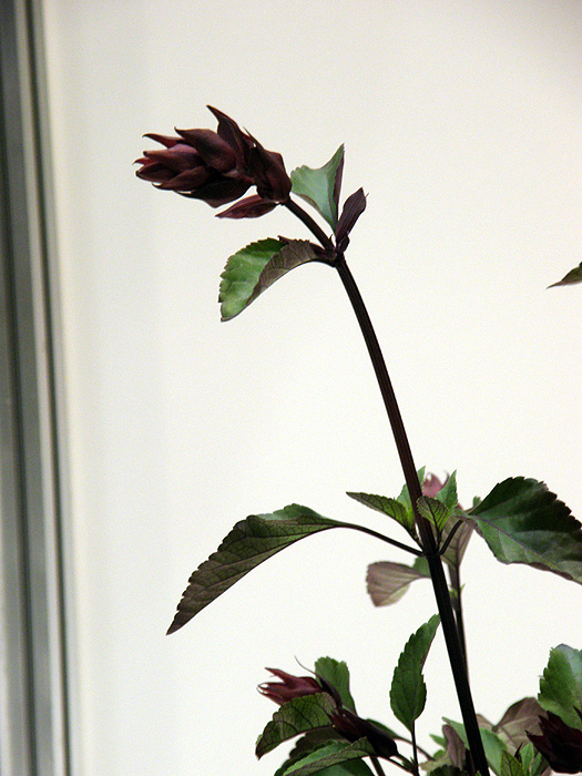 | 形態 | 株元からよく分枝し、直立する。葉は先がやや尖った卵形で、丸い鋸歯があり、対生する。5~11月頃、茎頂に、濃紫色〜ボルドー色の唇形花を数個まばらに輪生させたものを、十数段穂状に作る。萼と花柄は海老茶色〜黒紫色。 |