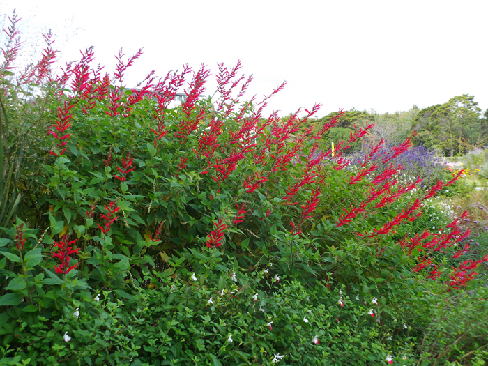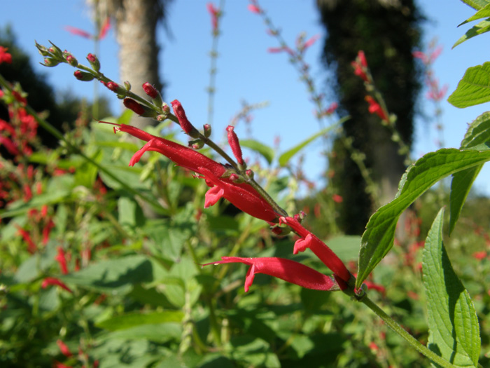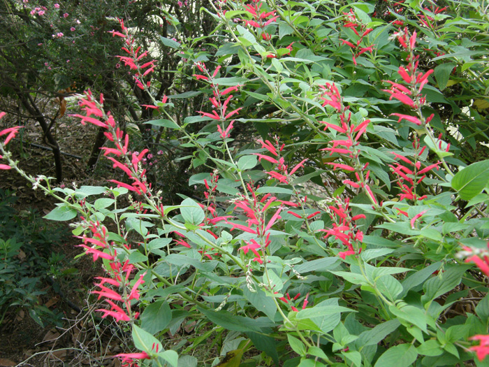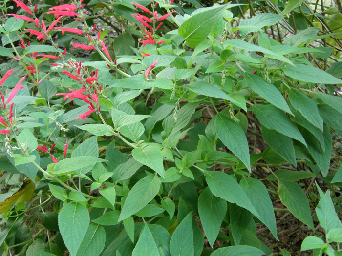 | 形態 | 株元からよく分枝し、直立する。葉は先の尖った長卵円形で、鋸歯があり、対生する。葉には「パイナップル」のような香りがある。10~12月頃、茎頂に、鮮やかな赤色の唇形花をまばらに輪生させたものを、十数段穂状に作る。花は輪生するが円形にはまとまらず、やや偏る。唇形花は筒部が細長い。 |