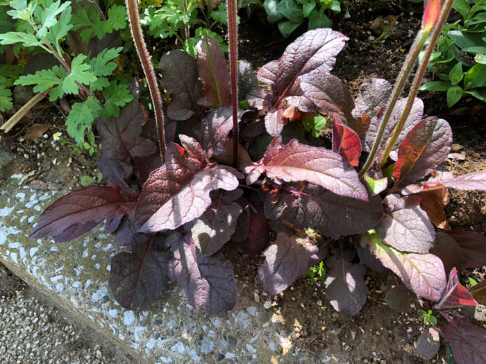| 形態 | 葉はロゼット状にまとまり、ヘラ形で深裂し、縁がやや波打つ。葉色は赤紫色〜黒紫色がかった緑色で、気温や日照などで変化する。4〜6月頃、花茎を立ち上げ、小さく目立たない淡紫色の唇形花を輪生させたものを、十数段穂状に作る。 |