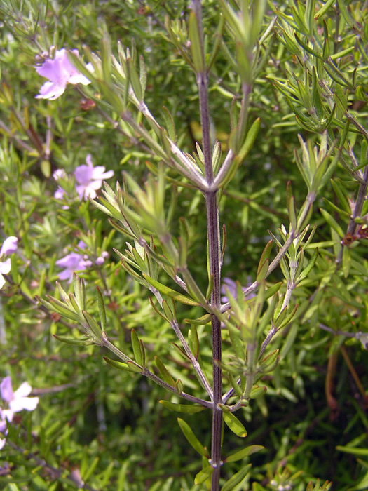| 形態 | 株元からよく分枝し、直立する。葉は線形で、3~4個が輪生する。枝上部の葉腋に、白〜淡紫色の唇形花を咲かせる。唇形花の中心部には紫色や山吹色の斑点がある。開花の最盛期は春だが、ほぼ周年咲く。 |
