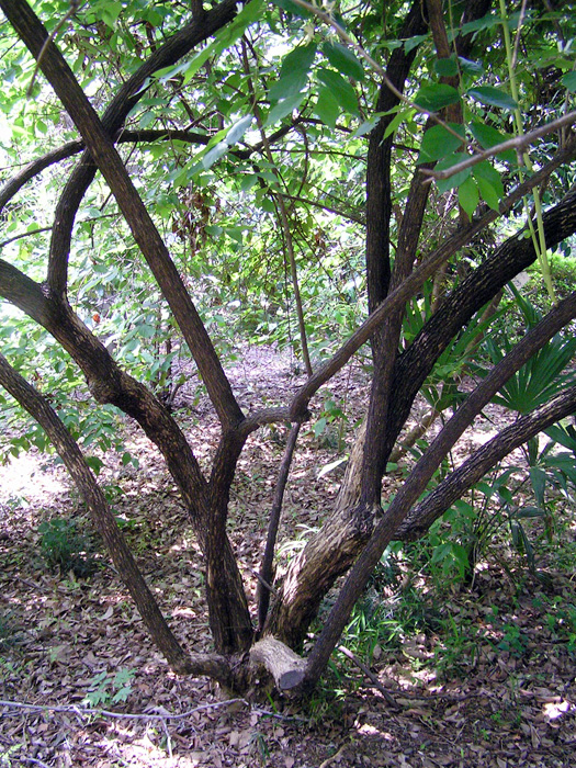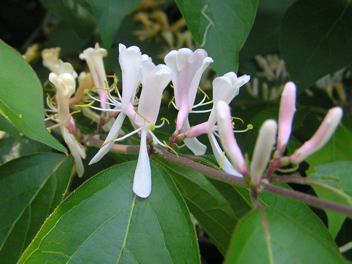 | 形態 | 樹皮は灰褐色で縦に裂け、よく分枝する。葉は先が細く尖ったの卵形~楕円形で、全縁、葉の両面には毛があり、対生する。4~6月頃、枝上部の葉腋に、2個が対になった花を咲かせる。花は下部が筒状で、先端は上に幅広い1片、下に幅が狭い1片の唇状になり、上片は先端が4裂する。花は初めは外側が赤味を帯びた白色で、次第に黄色くなる。果実は液果で、2個ずつが合着して瓢箪形になる。9~11月頃に、真っ赤に熟す。 |
