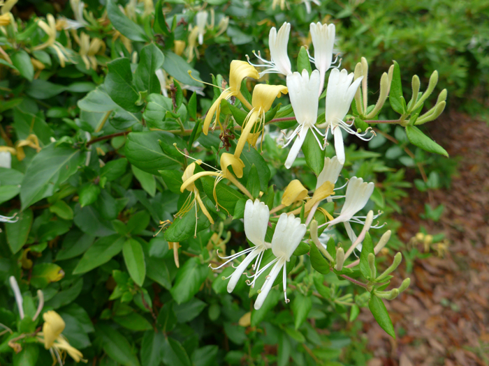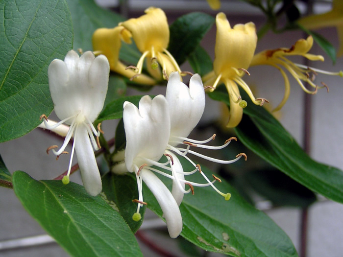 | 名の由来 | 「スイカズラ」は、管状になった花を口に含んで吸うと、甘い味がすることから。 「ニンドウ」は、冬にも葉が落ちないことから。 「キンギンカ」は、白い花と黄色い花が混ざって咲くことから。 |