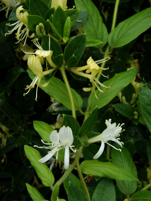 | 形態 | 茎は蔓になって、他物に巻きつきながら成長する。巻き方は左右どちらもある。若枝には褐色の毛がびっしりと生えるが、後になくなる。葉は先が鈍頭の長楕円形、基の方は円形あるいは楔形で、対生する。葉縁は全縁で両面に毛が生える。5~6月頃、枝上部の葉腋に、2個が対になった花を咲かせる。花は下部が細い筒状で、先端は上に幅広い1片、下に幅が狭い1片の唇状になり、上片は先端が4裂する。花冠の外面には軟毛が生える。花は初めは白色で、次第に黄色くなり、芳香がある。果実は球形の液果で、藍黒色に熟す。 |