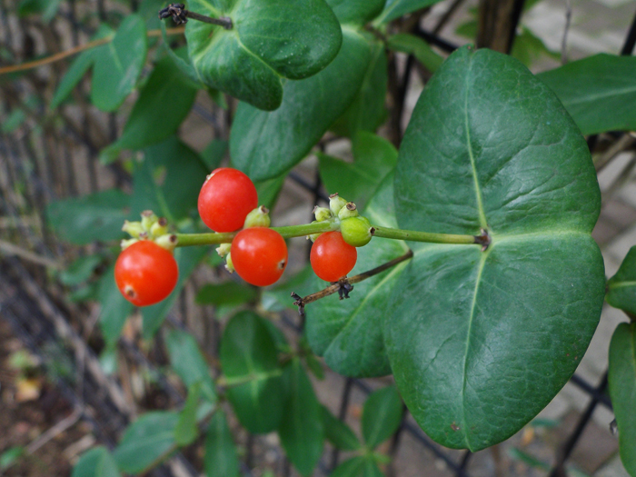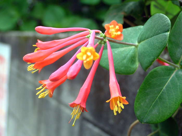 | 形態 | 茎は蔓になって、他物に巻きつきながら成長する。葉は先が鈍頭の楕円形、基の方は円形あるいは楔形で、対生する。花序のすぐ下の葉は基部が合着して1つの長蛇円形になり、葉から花柄が突き抜けて出ているように見える。5~9月頃、筒状花を輪生させたものを、数段穂状に作る。花は下部が細長い筒状で、先端が5裂する。花は朱色で、開花直後は内側が明るい橙色であるが、やがて内側も外側と同じ朱色になる。雄しべは花冠からやや突き出る。花に香りは無い。果実は球形の液果で、明るい朱色。 |
