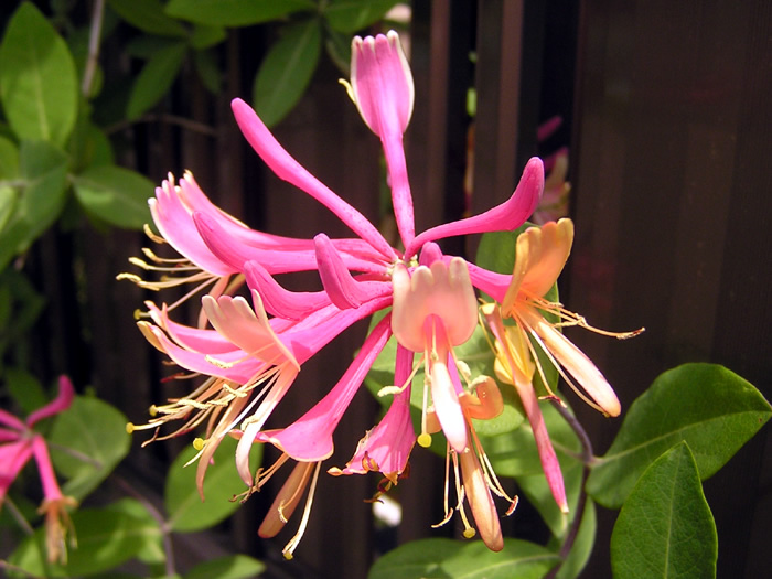 | 形態 | 茎は蔓になって、他物に巻きつきながら成長する。葉は先がやや尖った楕円形〜卵形で、全縁で、対生する。5~7月頃、枝上部の葉腋から、花序を出し、十数個の花を輪生させる。花は下部が細い筒状で、先端は上に幅広い1片、下に幅が狭い1片の唇状になり、上片は先端が浅く4裂する。花弁は外側が濃桃色で、内側がクリームイエロー。芳香が強い。~8月。花弁は外側が濃桃色で、内側がクリームイエロー。芳香が強い。 |