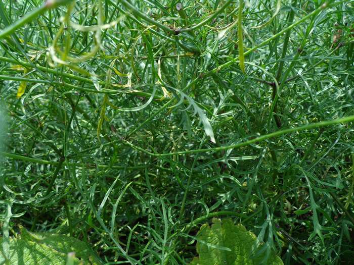 | 形態 | 若いうちはロゼット状で過ごす。根生葉、および若い葉は倒卵形で荒い鋸歯がある。春頃から茎を立ち上げる。茎はやや分枝する。茎が立ち上がる頃になると、根生葉は裂片がごく細い羽状に切れ込み、茎生葉も羽状に細く切れ込み、対生する。6〜10月頃、茎頂にクリーム色の頭状花を咲かせる。花は筒状で先端が5裂し、中央部ほど小さくなる。花序の外側の花は5裂した下側の3片が大きく外側に伸びる。果実は縦長楕円球形の複合果。 |