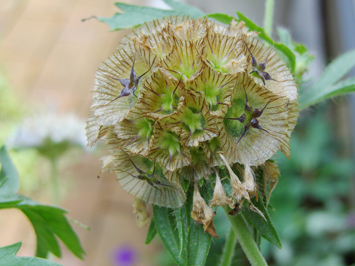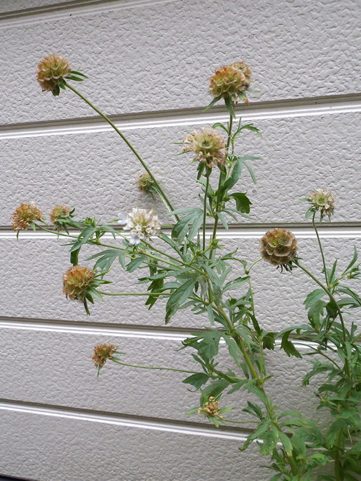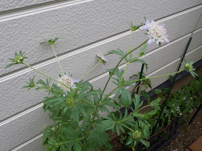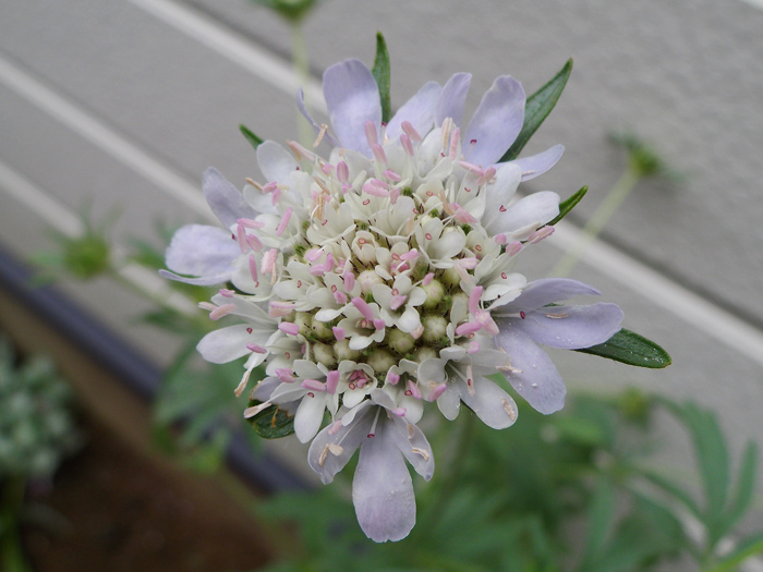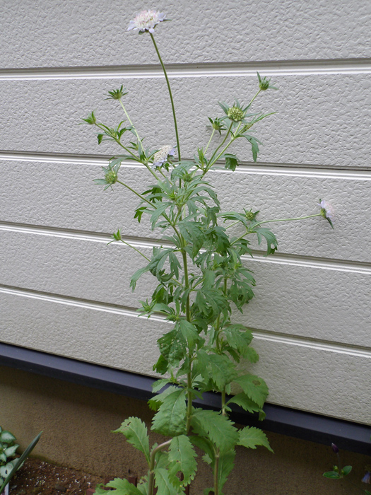 | 形態 | 若いうちはロゼット状で過ごす。根生葉、および若い葉は倒卵形で荒い鋸歯がある。春頃から茎を立ち上げる。茎はやや分枝する。茎が立ち上がる頃になると、根生葉は羽状に切れ込み、茎生葉も羽状に切れ込み、対生する。5〜7月頃、茎頂に青みがかった白色の頭状花を咲かせる。花は筒状で先端が5裂し、中央部ほど小さくなる。花序の外側の花は5裂した下側の3片が大きく外側に伸びる。果実は球形の複合果。 |
