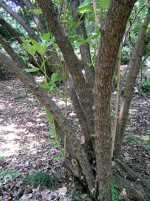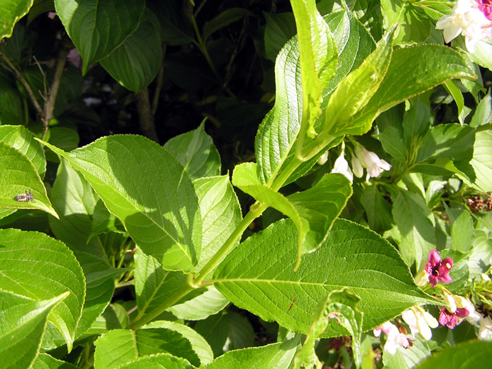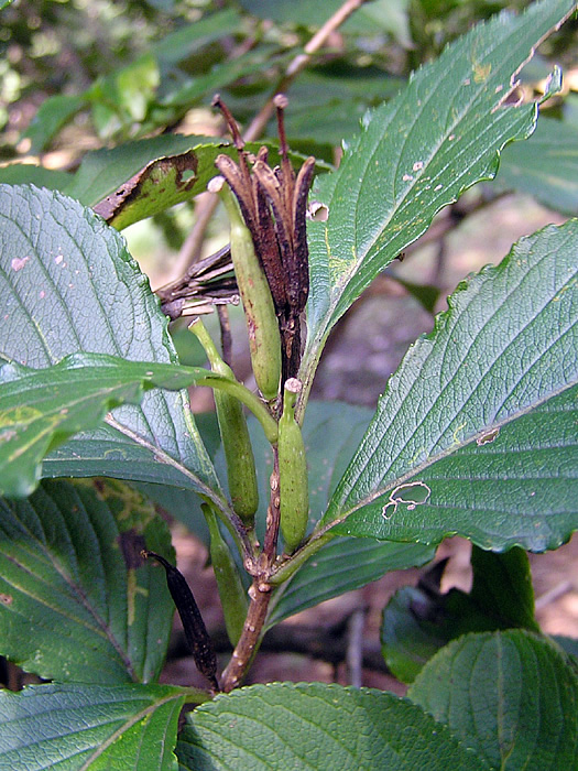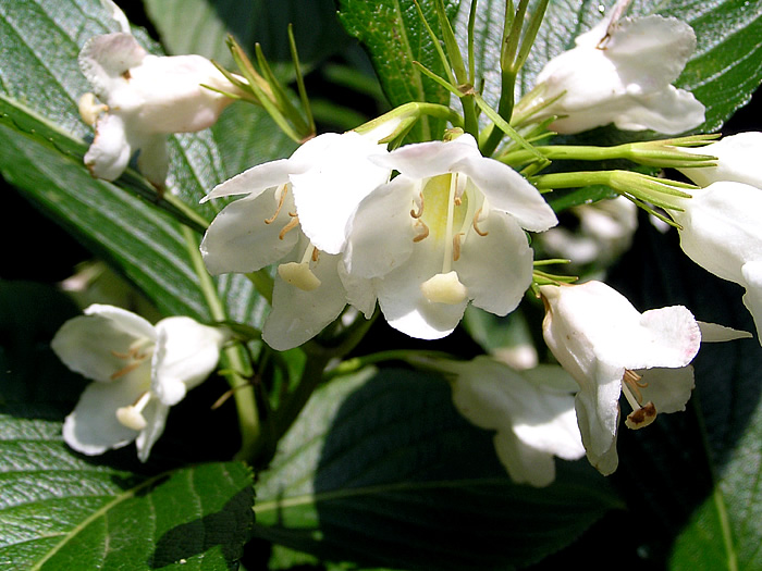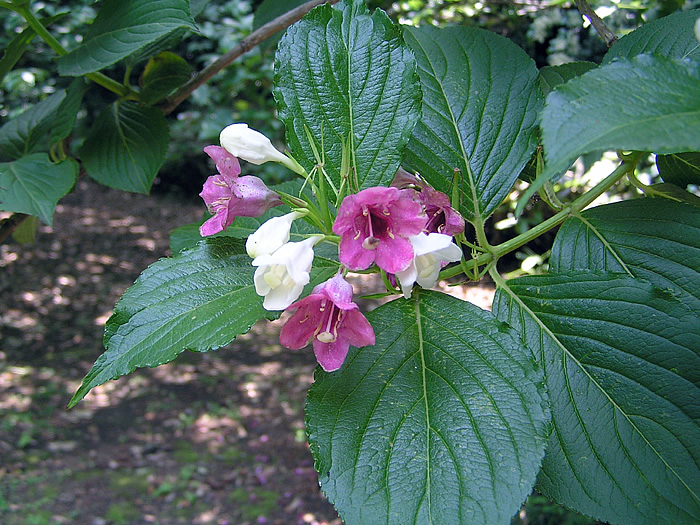 | 形態 | 主幹ができ、幹からたくさんの細い枝を出す。樹皮は灰褐色で縦に裂けてはがれる。若枝は無毛。葉は先が細く尖った楕円形〜広卵形で、鋸歯があり、対生する。葉はほぼ無毛で、やや光沢がある。5~6月頃、1年枝の先端や葉腋から筒状花を2〜3個づつ咲かせる。花は花筒の根元から急に太くなる釣り鐘形で、先端が5裂し、花色は初め白で次第に紅色に変化する。果実は円筒型の蒴果で、10月頃熟すと上部が割れて、長さ1mmほどの黒い種子を多数出す。種子には周囲に翼がある。 |