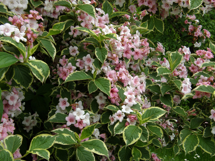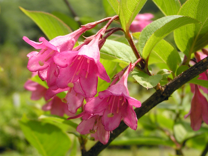 | 形態 | 樹形は株立ち。葉は先が尖った卵形で、鋸歯があり、対生する。5~6月頃、1年枝の先端や葉腋から筒状花を2〜3個づつ咲かせる。花は漏斗形で先端が5裂し、花色は濃紅色。 |