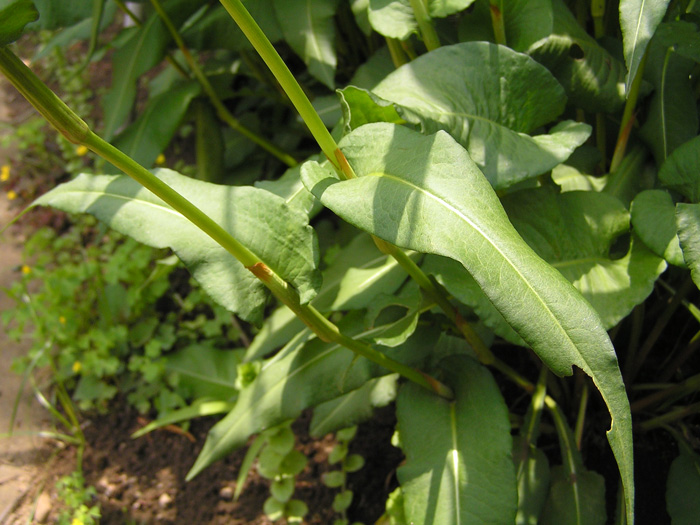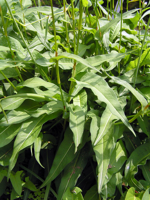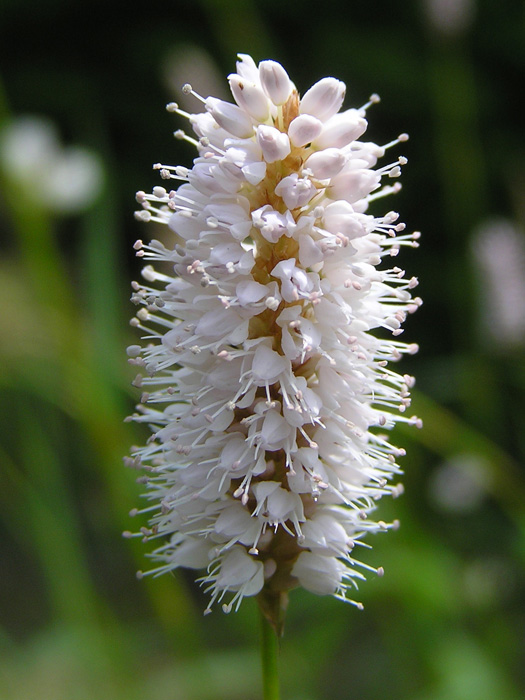 | 形態 | 地際から茎を叢生させる。茎は直立し、分枝しない。葉は先が尖った狭卵形~披針形で、根生葉には長い葉柄がつき、茎生葉は無柄で葉の基部は茎を抱く。鞘状の托葉がつく。7~9月頃、茎頂に円柱形の花序を作り、白色~淡紅色の花を咲かせる。花には花弁はなく萼片が5深裂し、花被片からは雄しべが長く突き出る。果実は3稜形の痩果。 |