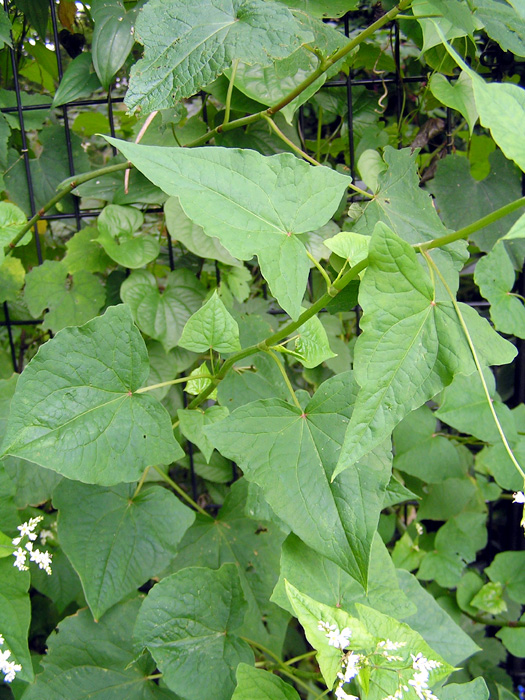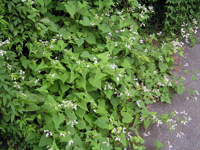 | 形態 | 株元から叢生する。茎は中空で、下部は淡紅色がかる。葉はほぼ正三角形で、長い柄があり、互生し、鞘状の托葉がある。9~11月頃、上部の葉腋から花柄を伸ばして2~3に分岐して、花序を作り、白い小花を数個ずつ咲かせる。花には花弁はなく萼片が5深裂し、葯は桃色。果実は三角錐形の痩果で、黒褐色に熟す |