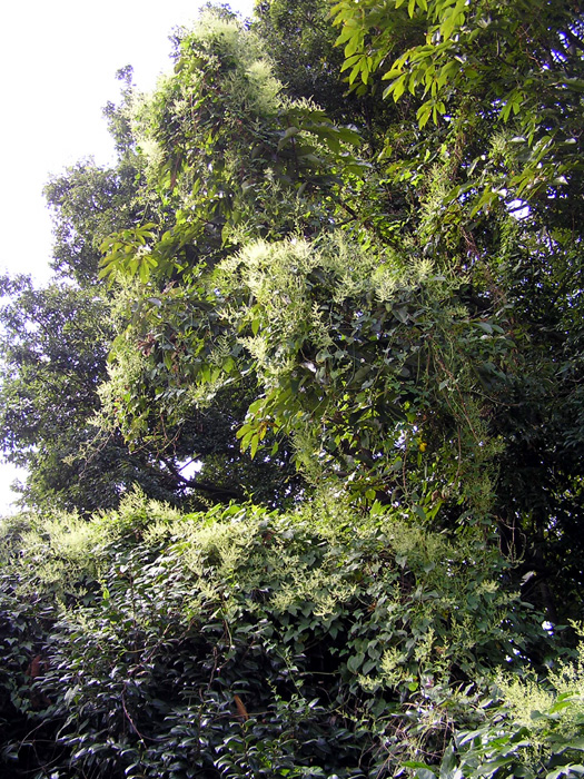 | 形態 | 土中に大きな塊根をつくる。茎は細く軟弱で、よく分枝しながら、他物に巻きついて成長する。葉はハート形〜長ハート形で、柄があり互生する。葉柄の根元には鞘状の托葉がある。8~10月頃、葉腋から円錐花序を作り、多数の雄花と雌花を混在してつける。花には花弁はなく白色〜黄白色の萼片が5深裂する。果実は3個の翼がある痩果。 |