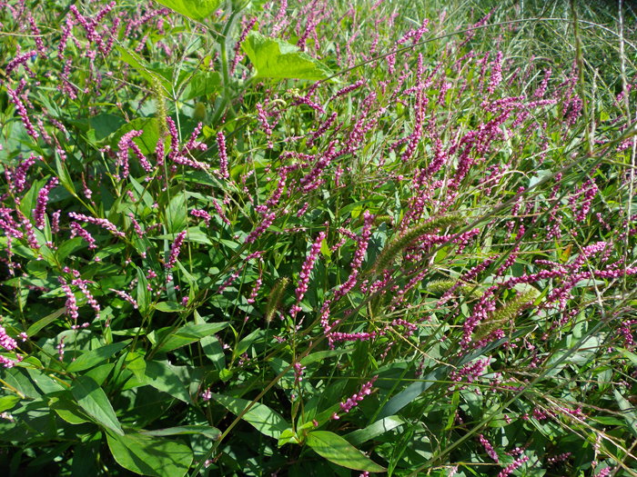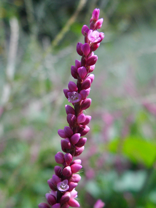 | 形態 | 茎は直立してやや分枝し、赤味を帯びることが多い。葉は披針形で、全縁で、互生する。葉の基部には筒状の托葉鞘があり、縁には長い毛がある。6~11月頃、茎頂に薄桃色〜濃桃色の穂状花序を作る。花弁に見える部分は萼で、先端が4〜5裂する。蕾、花、花後の状態がすべて同じような色合いなので、長期間花が咲いているように見える。果実は3稜形の痩果で、花被に包まれたまま光沢のある黒褐色に熟す。 |