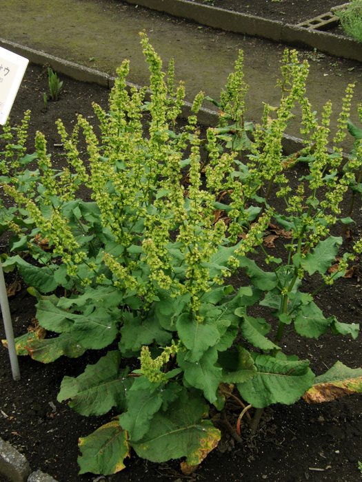 | 形態 | 茎は太く直立し、縦に稜線がある。根生葉は長楕円形で、長い葉柄があり、基部はハート形で、葉縁は波状になる。茎生葉は卵状広楕円形。5~7月頃、茎上部が分枝し、多数の花穂をつける。花は緑色。花後、内花被片は翼状になる。内花被片は縁に鈎状の鋸歯がある。果実は痩果。冬はロゼット状で越冬する。 |