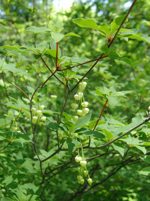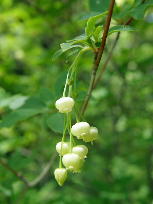 | 形態 | 茎は基部からよく枝分かれして株立ち状になる。樹皮は灰色で滑らか。若い小枝は赤褐色。葉は先が尖った倒卵形で、細かい鋸歯があり、枝先に集まって螺旋状に互生する。葉表面の脈上には毛が生え、裏面には光沢がある。秋には紅葉する。5〜6月頃、枝先に総状花序を作り、5~10個の花を長い花柄で垂れ下げて下向きに咲かせる。花は扁球形の壺形で、白緑で、花冠先端はすぼまり、浅く5裂して外側に巻く。花柄は薄黄緑色。果実はほぼ球形の蒴果で、紅葉後に熟し、果柄も果実も下を向く。 |