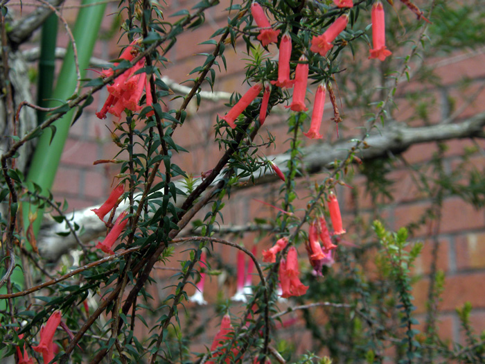 | 形態 | 茎は基部からよく枝分かれして株立ち状になる。若枝は茶褐色で、白い細毛が密生する。葉は披針形で、全縁で、互生する。主に春と秋に葉腋から筒状花を下向きに咲かせる。花は朱赤色の細長い筒状で、花冠先端部が浅く5裂して外側に広がる。 |