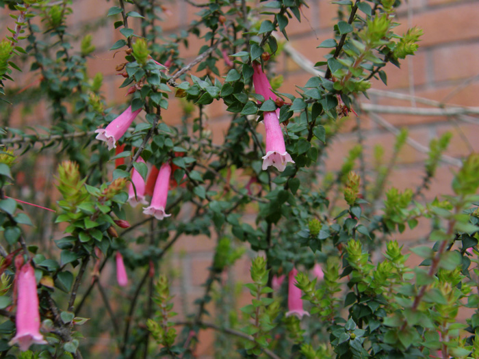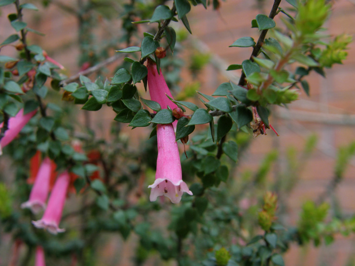| 形態 | 茎は基部からよく枝分かれして株立ち状になる。葉は先が細く尖った卵形で、全縁で、互生する。主に春と秋に葉腋から筒状花を下向きに咲かせる。花はピンク色〜赤色の、やや円錐状に広がった細長い筒状で、花冠先端の縁がやや白っぽく、浅く5裂する。 |