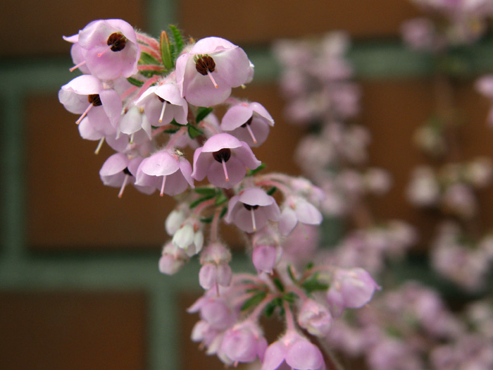| 形態 | 茎は下部からよく枝分かれする。茎葉には軟毛が密生する。葉は緑色の線形で、茎に輪生させる。12月~翌4月頃、枝の上部に、多数の花を下向きに咲かせる。花は平たい釣鐘型で、花冠先端部が4裂する。花冠はくすんだ桃色で、雌しべが突き出し、雄しべの葯は褐色で目立つ。花冠の基部には花冠と同色の4裂した萼がつく。 |