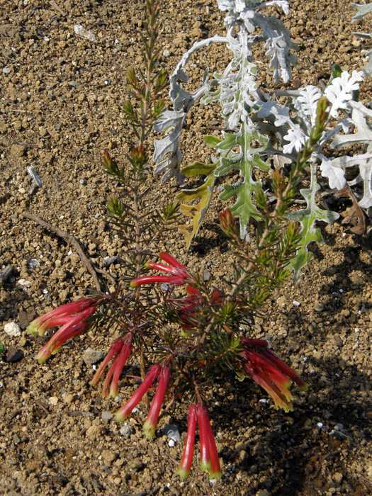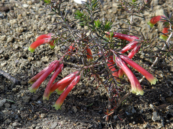 | 形態 | 茎は下部からよく枝分かれする。葉は鮮緑色の線形で、茎に輪生させる。葉はややまばらにつく。3~4月頃、枝の中央部に花を数個づつ束生させ、やや下向きに咲かせる。花は先端がやや太くなる細長い筒状で、やや弓なりに下を向き、花冠先端部が浅く4裂する。花冠は赤で、先端部がライムグリーンの複色、またはピンク色で、先端部が白緑色の複色。花冠の基部には4裂した萼がつく。 |