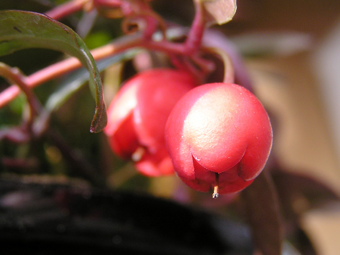 | 形態 | 茎は下部からよく枝分かれする。春にはランナーが伸びて横に広がる。葉は革質で光沢のある濃緑色~暗緑色で、先がやや尖った楕円形で、互生する。葉は寒さに当たると赤味を帯びる。5~9月頃、葉腋に釣鐘形の花を下向きに咲かせる。花は淡い桃色を帯びた白色で、先端が浅く5裂する。花冠の基部には花冠と同色の5裂した萼がつく。9月頃には、肥大した萼が肉質の果実を形成する。果実は艶のある赤色で、先のくぼんだ球形をし、翌年の晩春まで残る。葉と果実には、湿布薬のような香りがある。 |