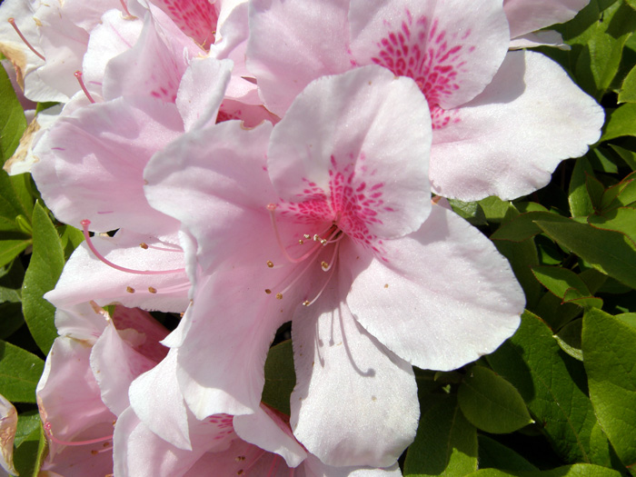 | 形態 | 主幹はなく、分岐して株立ち状の樹形になる。葉色は明るく、全縁の狭楕円形~卵形で、枝先に集まって互生する。葉の表面や新梢には短い軟毛が密生する。4~5頃、枝先に2~5個の大型の花をつける。花冠は漏斗形で5中裂し、花の裂片の上側の弁に、濃桃色のブロッチと呼ばれる斑点模様が入る。10本ある雄しべは長く伸び、先端が上に曲がる。 |