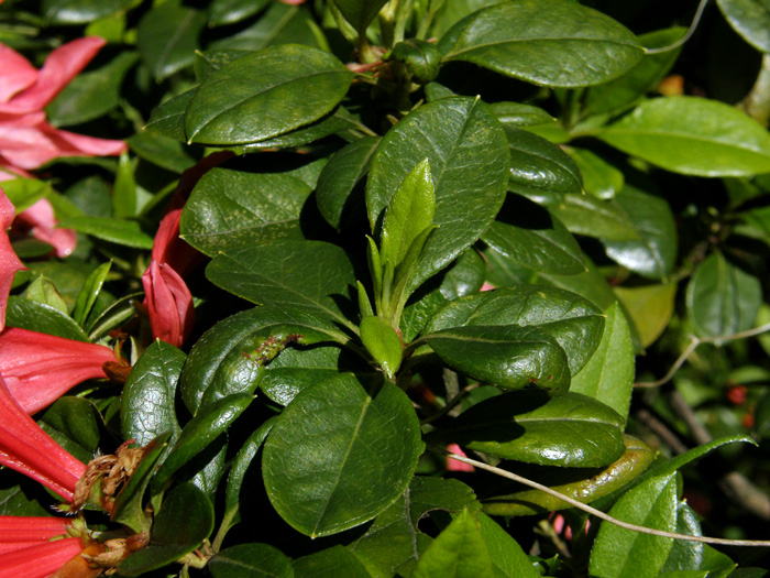 | 形態 | 若枝には褐色の剛毛が密に生える。全縁で楕円形~長楕円形の葉が、互生または枝先に束生する。葉は濃緑色の革質で、両面に剛毛がある。3~6月頃、枝先に2~4個の花をつける。花は朱赤色で、花の裂片の上側の弁に、赤いブロッチと呼ばれる斑点模様が入る。10本ある雄しべは長く伸び、先端が上に曲がる。 |