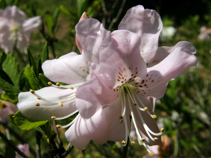 | 形態 | 4~5月頃、葉と花がほぼ同時に展開する。葉は黄緑色の披針形で、枝先に5輪生する。葉は秋に紅葉する。花は淡桃色で、花の裂片の上側の弁に、赤いブロッチと呼ばれる斑点模様が入る。10本ある雄しべは長く伸び、先端が上に曲がる。花には芳香がある。 |
