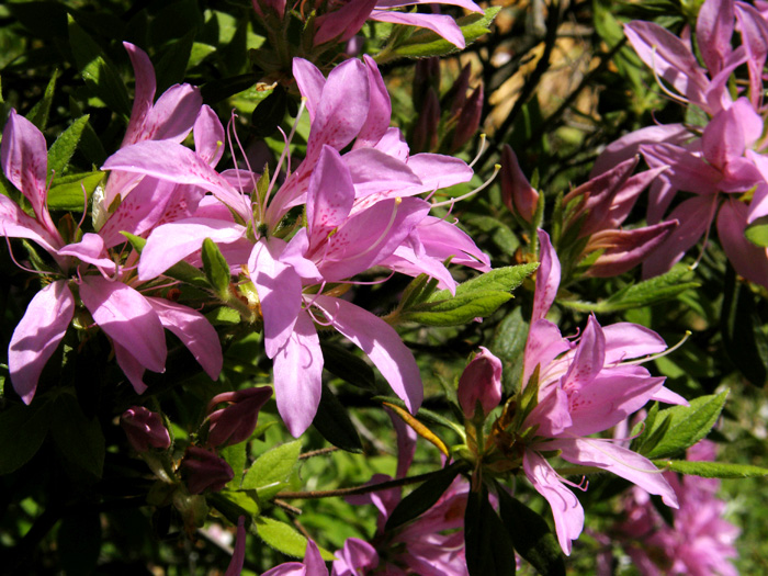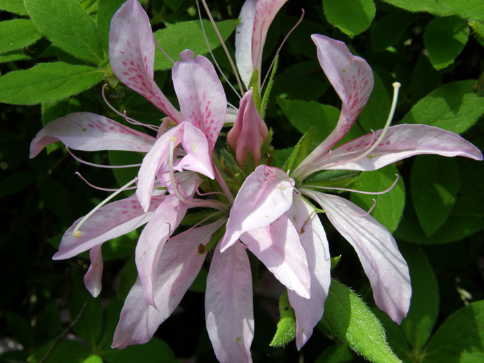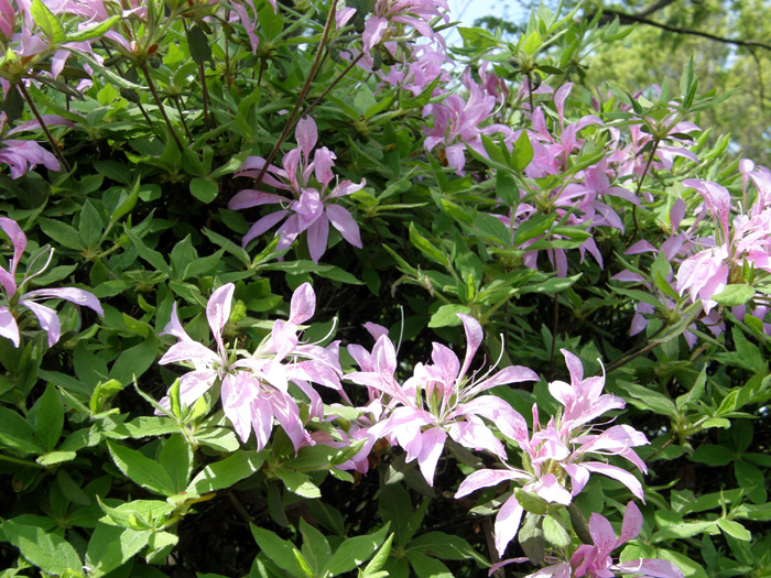 | 形態 | 主幹はなく、荒く分岐して株立ち状の樹形になる。春に展開し秋に落葉する大きな春葉と、夏から秋に展開し越冬する小さな夏葉がある。葉は全縁の狭楕円形~卵形で、互生する。秋には橙色~赤黒紫色に紅葉する。葉の表面や新梢には長軟毛が垂直に密生する。4~5頃、枝先に1~5個の花をつける。花冠は漏斗形で5中裂し、花色は薄桃色~紅紫色で、花の裂片の上側の弁に、濃桃色のブロッチと呼ばれる斑点模様が入る。雄しべは通常5本、6~10本の場合もあり、長く伸び、先端が上に曲がる。萼片は「キシツツジ」に比べて大きい。萼片や花柄には腺毛が密生して、よく粘る。 |