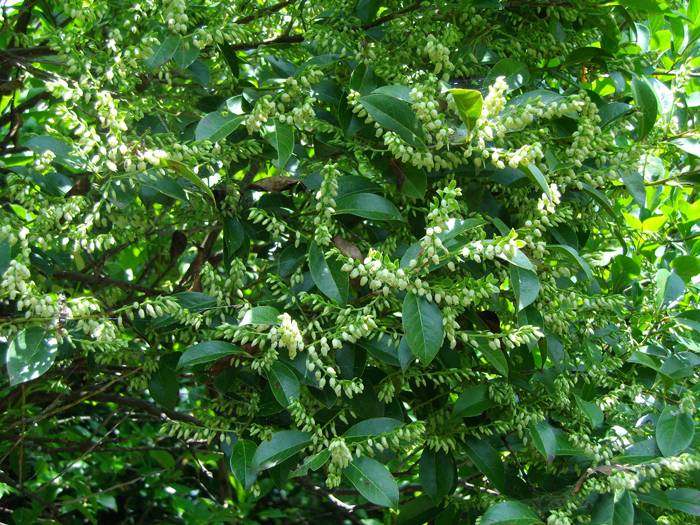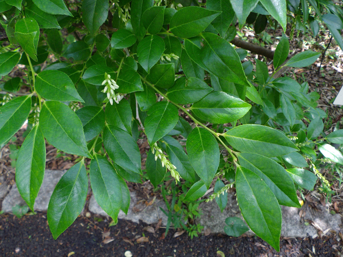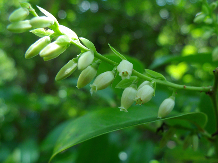 | 形態 | 樹皮は灰色で、年数がたつと縦にはがれ落ちて、赤褐色の肌が露出する。下部からよく分枝する。葉は緑色で、短い葉柄があり、先が尖った長卵形〜長楕円形で、浅い鋸歯があり、互生する。7月頃、前年の枝の葉腋から総状花序を作り、十数個〜二十数個の花を房状に枝垂れさせて下向きに咲かせる。花は乳白色の壺形で、花冠先端部が5裂して外側に平開する。花冠の基部には5裂した萼がつく。短い花柄の基に苞葉が1~2枚つく。果実は球形の液果で、9〜10月頃、黒紫色に熟す。 |