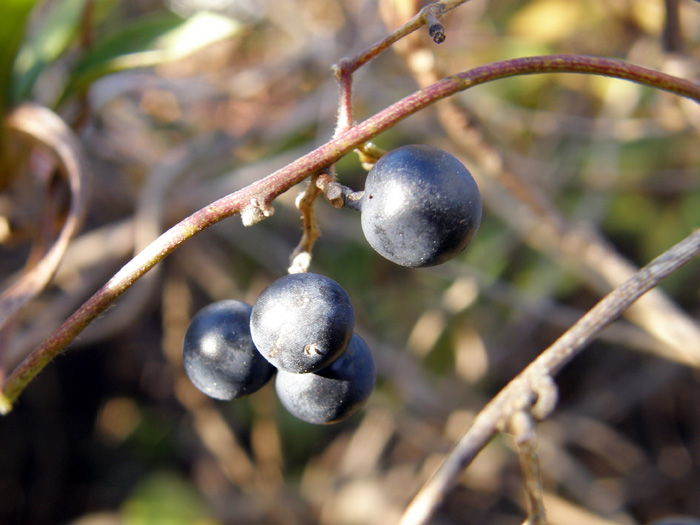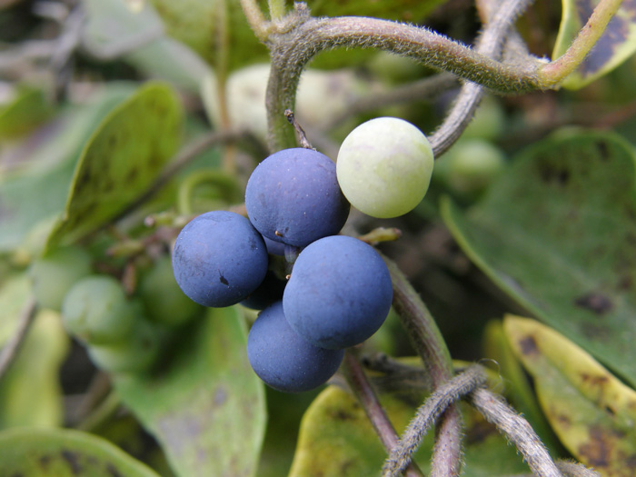 | 形態 | 1年めの茎は緑色で、2年以上の茎は褐色となり、木本化する。細毛に覆われた茎が、やや分枝しながら他物に巻きつきながら生長する。葉は先が尖った長卵型、または3裂し、表裏面ともに細毛が生え、互生する。7~8月頃、葉腋に円錐花序を作り、黄白色の小花を多数咲かせる。雌花雄花ともに花弁は6個で先端が2裂する。萼片は花弁と同色で、3個は大きく外側の3個は小さい。雄花の雄しべは6個。雌花の花柱は6個。果実は球形の液果で、表面に白い粉をふき、白緑色→青味がかった黒色→黒色になり、10〜12月頃熟す。種子は扁平で細かい横シワがあり、まるまってカタツムリの殻のような形状をしている。 |