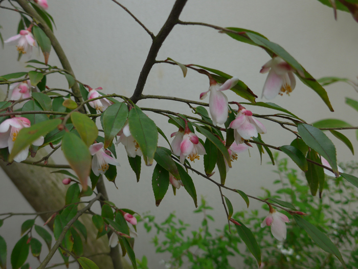 | 形態 | 低い位置からよく分枝し、株立状になる。枝は細く湾曲して垂れ、先端部は下垂する。葉は先が尖った狭楕円形で、細かい鋸歯があり、互生する。葉色は濃緑色で、冬季は赤銅色になる。3~4月頃、枝先の葉腋に花を下向きに咲かせる。花弁は5〜7個で、平開せず、白色〜薄桃色で外側がピンクがかる。 |