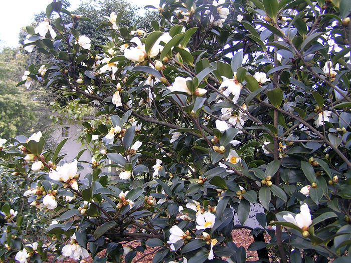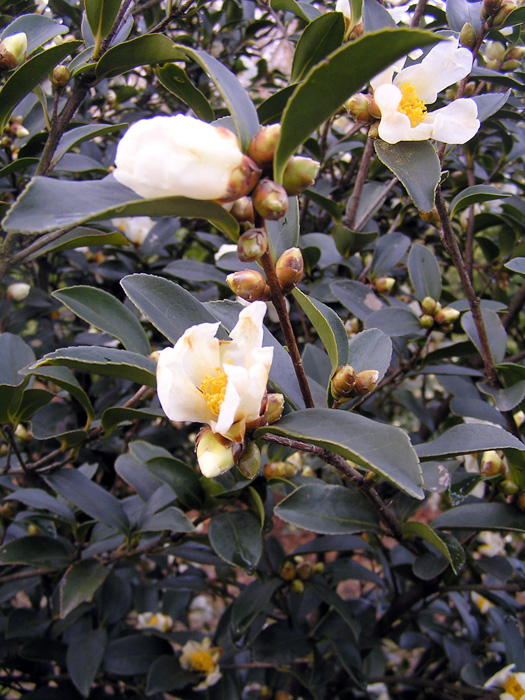 | 形態 | 葉は先が尖った楕円形で、深緑色の革質で、細鋸歯があり、互生する。11~1月頃、白い花を咲かせる。花弁同士の隙間が広くあく。 |