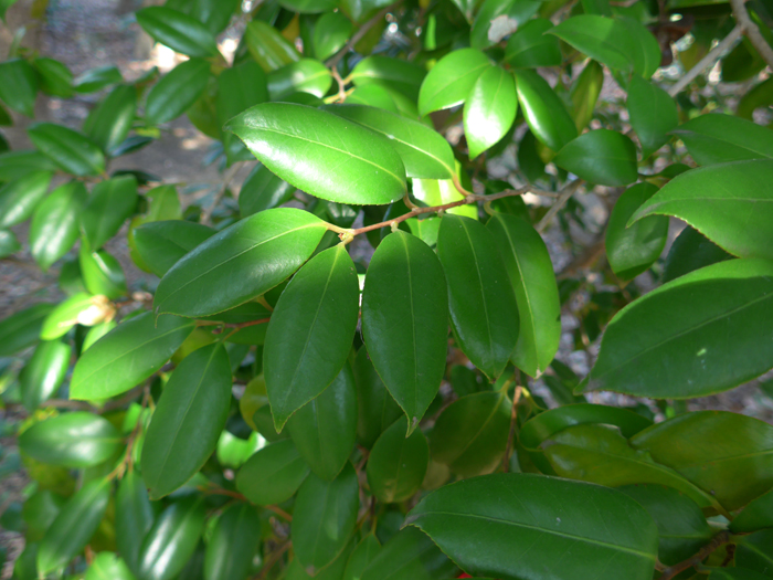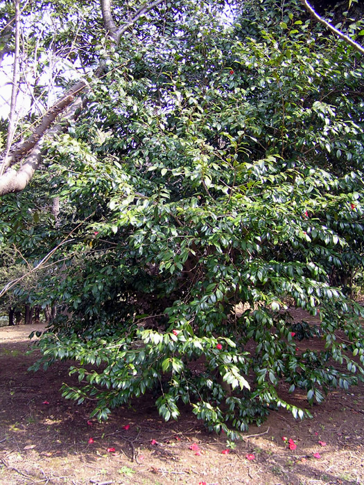| 形態 | 低い位置からよく分枝する。樹皮はなめらかで灰褐色。葉は先が尖った楕円形で、厚手で表面に光沢がある革質で、濃緑色で、裏面に向けてやや反る場合が多い。両面とも無毛で、縁には細鋸歯があり、互生する。12月~翌4月頃、枝先の葉腋に桃紅色の花を咲かせる。花弁は5個で、平開しない。雄しべの花糸は白く、下半分ほどが合着して筒状になり、基部では花弁とも合着するため、花が散る時は、花首からまとまって落ちる。葯は黄色。果実はほぼ球形の蒴果で、表面は光沢がある赤褐色で、熟すと木質の果皮が3裂して、3~6個の種子を出す。 |
