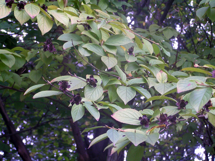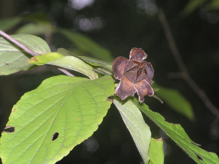 | 形態 | 幹は直立し、枝を上向きに立てる。樹皮は滑らかで、老木では樹皮の一部が剥離して、灰白色や赤褐色の斑模様になる。葉は先が尖った倒長卵形〜楕円形で、ごく浅い鋸歯があり、互生する。6~7月頃、当年枝の葉腋に白い花を咲かせる。花弁と萼は5個で、雄しべは多数。花弁にはしわがあり、縁には細鋸歯がある。花の下には2枚の苞がある。花は朝に開花し夕方に落花する一日花。果実は先が細く尖った長球形の蒴果で、10月頃熟すと5裂して、種子を出す。種子は偏平な楕円形で、翼があるものと無いものがある。 |