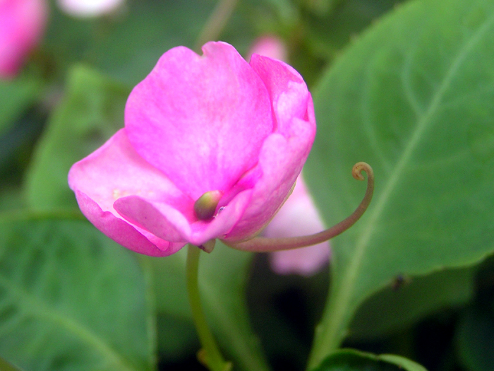 | 形態 | 株元から分枝する。葉は先の尖った卵形で、鋸歯があり、互生する。7~9月頃、葉腋に2~3個ずつ、赤い花を咲かせる。花の後方には距が長く伸びるが、花弁が平開するので、正面からだと距はあまり目立たない。果実は蒴果で、熟すとわずかな刺激で弾け、種を遠くに飛ばす。 |