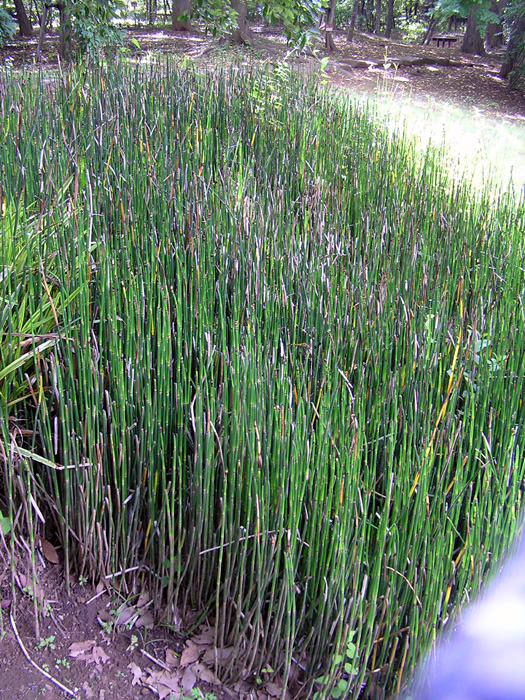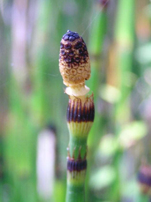 | 形態 | 地下茎が地中を伸びて群生する。地下茎から出る茎は直立し、通常分岐しない。茎は濃緑色で、表面はざらつきがあり、縦方向に15~25本の稜があり、硬い。茎は中空で節があり、節を囲むように袴と呼ばれる茶色でギザギザの鞘状に合着した葉が茎を取り巻く。7月頃、茎頂に長球形の胞子穂をつける。 |