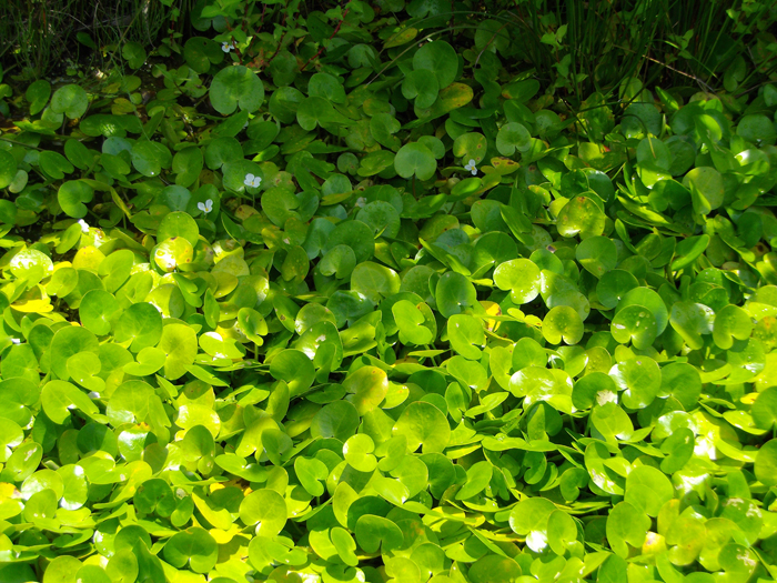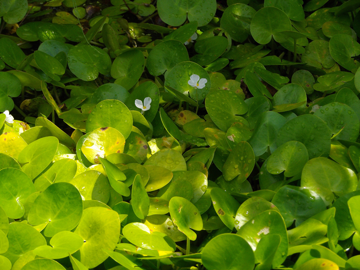 | 形態 | 水生。匍匐茎を伸ばして広がり、水面を覆う。匍匐茎は淡緑色で節から発根し、葉を伸ばす。葉は全縁のほぼ円形で、基部はハート形、濃緑色で光沢があり、葉柄は葉身に盾状につく。葉の裏側中央には気嚢と呼ばれる浮袋があり、これにより葉が水面に浮かぶ。葉が混み合うと、茎が水上に立ち上がる気中葉ができるが、これには気嚢が無い。7〜10月頃、匍匐茎の節から長い花柄を伸ばし、水上に花を1個咲かせる。雌雄異株で雌花と雄花がある。花は白色で3個の花弁を持つ1日花。花後、花柄は下向きに曲がり、水中で果実ができる。晩秋に茎の先端に葉鞘に包まれた殖芽を作り、水底に沈んで越冬する。 |