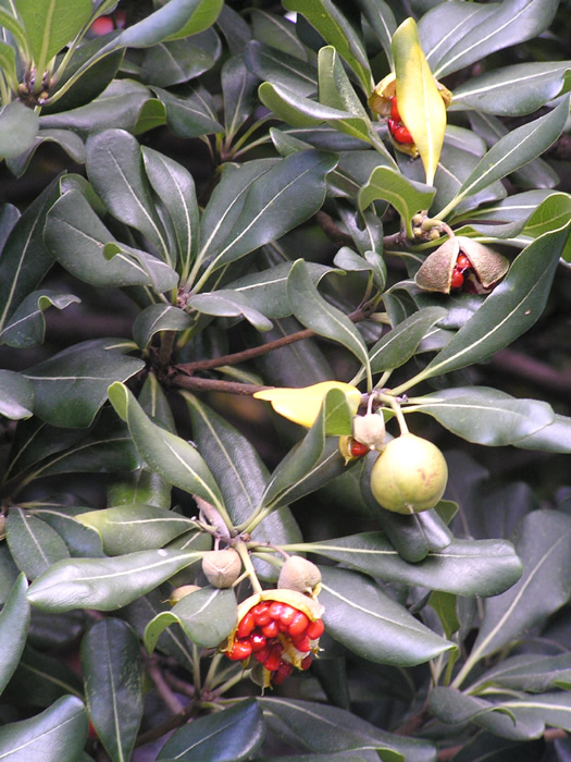 | 形態 | 下部からよく分枝し、半球形の樹形になる。葉は先が丸い長倒卵形で、全縁、螺旋状に互生し、枝の先端に集まるので輪生のように見える。葉は内側に巻き込む傾向がある。若葉の時には微毛があるが、後に無毛となる。4~6月頃、1年枝の先端に集散花序を作る。花は5弁花で、咲き始めは白で、次第に黄色味を帯び、芳香がある。5個の雄しべと1個の雌しべがあるが、雄花の雌しべは小さく不稔、雌花の雄しべは葯の発達が悪い。果実はほぼ球形の蒴果で、秋に熟すと3つに割れて中から種子が出る。種子は赤橙色で、透明な粘液質の物質に包まれている。 |