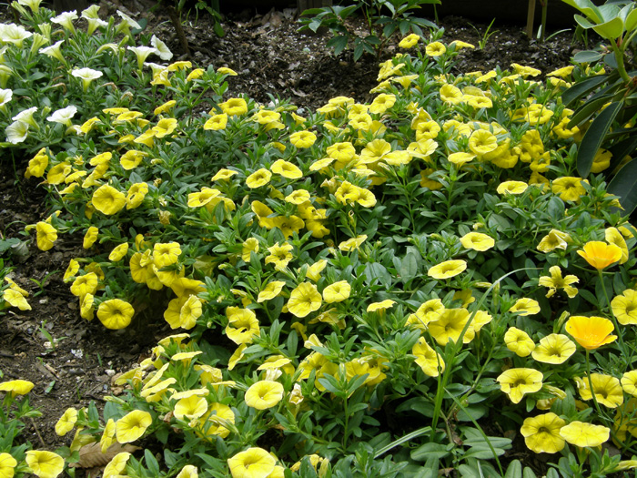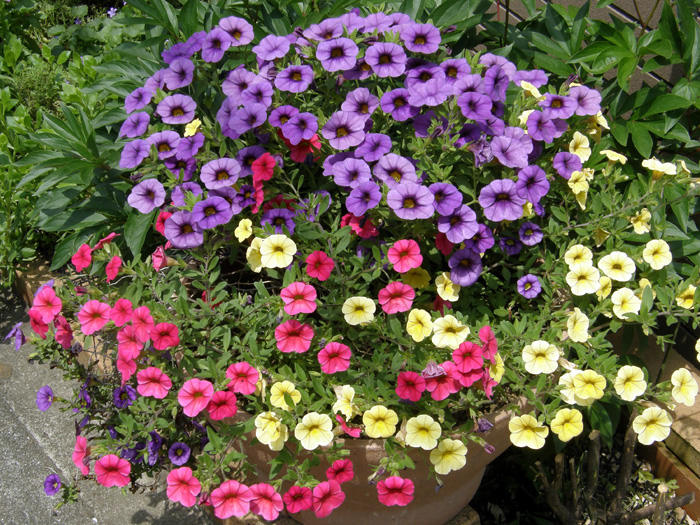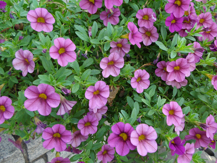| 品種 | 花色は赤、桃、青、紫、黄、オレンジ、白など多彩。 “サントリー”の「‘ミリオンベル®’」や“サカタのタネ”の「‘リリカシャワー®’」などもこの品種。 カリブラコア属とペチュニア属との交配種「ペトコア属 Petchoa」も作り出されている。 |