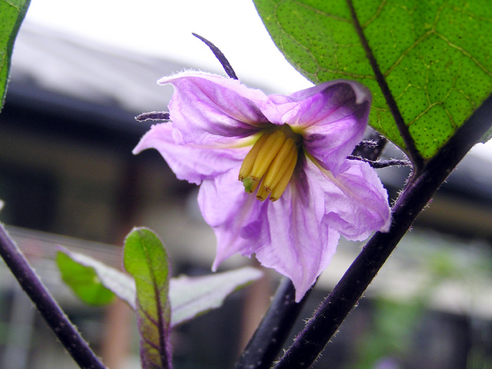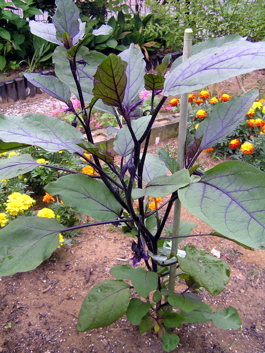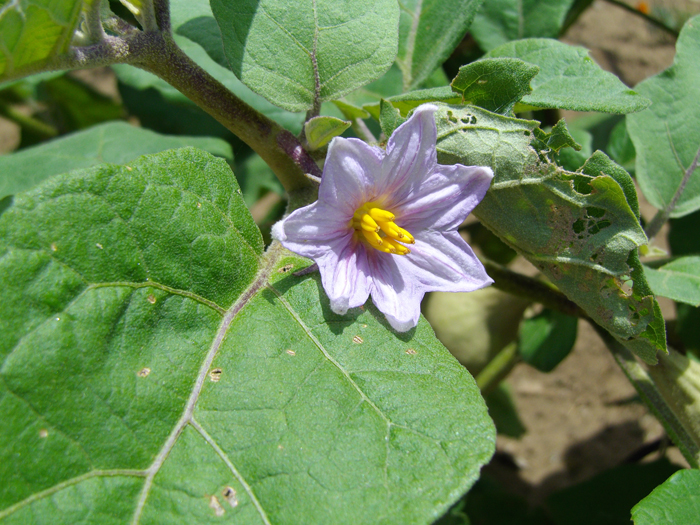 | 形態 | 茎は直立して分枝する。茎は黒紫色になるものも多く、まばらに棘がある。葉は先が尖った長卵形で、葉縁が波状になるものもあり、互生する。葉柄と葉脈が黒紫色になるものも多い。6~10月頃、葉腋に薄赤紫色の花を1個下向きに咲かせる。花冠は先が5〜7浅裂し、平開する。黄色の雄しべが雌しべの回りを筒状に取り囲むように並ぶ。果実は長卵形や卵形、棒状など品種によって様々。果実の色は黒紫色や白緑色で、熟すと黄色になる。 |