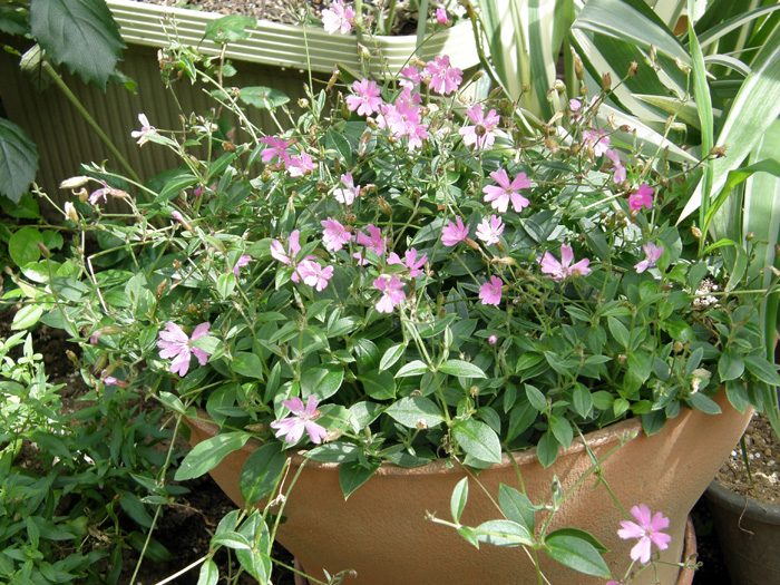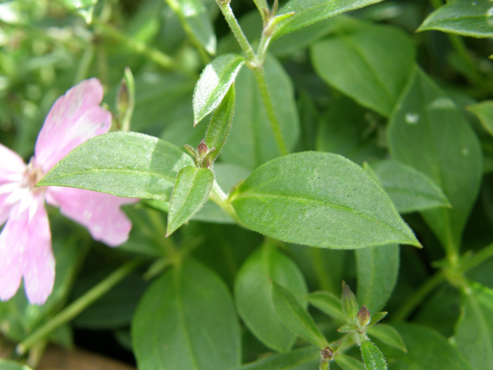 | 形態 | 冬季は地上部が枯れ、3月頃新芽が出る。茎は軟弱で地を這って伸び、岩壁などでは垂れ下がる。茎は赤味を帯び、細かな毛が生えている。葉は、先が尖った楕円形で、対生する。7〜9月頃、茎頂に花序を作り、ピンク色〜紅紫色の5弁花を咲かせる。花弁は長倒卵形で、先端が凹む。花弁基部に鱗片がつく。萼は筒状で、赤っぽい縦筋が入り、毛が生える。果実は蒴果。 |