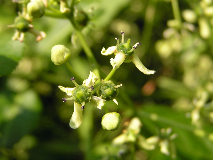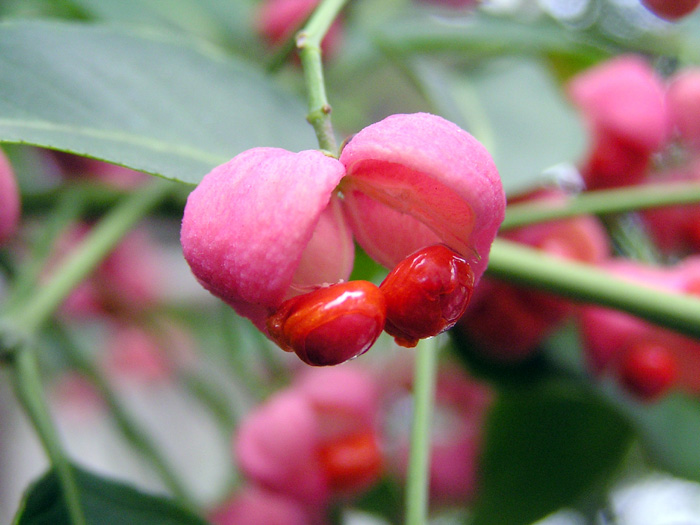 | 形態 | 樹皮は灰褐色で縦に筋が入る。枝は鈍い4稜がある。葉は先が尖った楕円形~倒卵形で、細かな鋸歯があり、対生する。両面とも無毛。 5~6月頃、新しく伸びた枝の葉より下部から数本の花柄を出して集散花序を作り、淡緑色の4弁花をまばらに咲かせる。花は雌しべが長く、雄しべが短いタイプと、雌しべが短く、雄しべが長いタイプがあり、雌雄異株とする資料もあるが、1本で結実するし、雌しべが短いタイプでもまれに結実が見られる。果実ははっきりと4稜がある角張った扁球形の蒴果で、11月頃に淡紅色に熟すと4裂し、中から赤い仮種皮に覆われた種子が露出する。 |