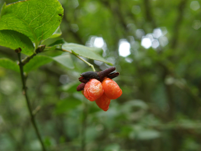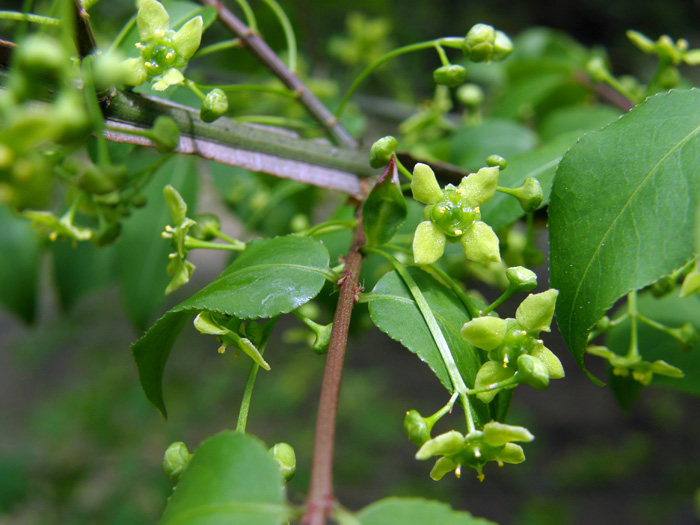 | 形態 | 樹形は株立ち状、または下部から多数分枝する。枝葉は密に茂る。樹皮は灰褐色で縦に筋が入る。枝は4稜があり、硬いコルク状の翼に発達する。葉は先が尖った楕円形~倒卵形で、細かい鋸歯があり、対生する。5月頃、葉脈から花序を出し、薄黄緑色の4弁花を2~3個咲かせる。果実は長球形の蒴果で、赤く熟すと果皮が割れて、中から朱色の仮種皮に覆われた種子が露出する。割れた果皮は小さくまるまる。 |