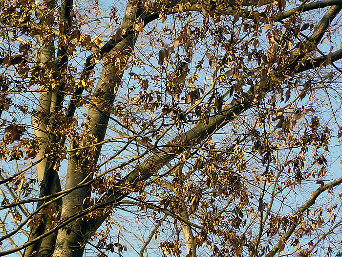 | 形態 | 幹を立て、枝を斜めに大きく広げ、ほうきを逆さにしたような樹形になる。樹皮は灰褐色で、老木になると鱗片状にはがれ落ちる。葉は先が尖った狭卵形で、鋸歯があり、互生する。秋には黄~赤に紅葉して、落葉する。4~5月頃、1年枝の葉腋に花を咲かせる。下部の葉腋に雄花が、先端には雌花がつく場合が多いが、混ざり合うこともあり、両性花もある。夏になると、稜角のあるゆがんだ扁球形の実をつけ、紅葉の頃に、灰黒色に熟す。実は、そのまま落下するものと、葉や枝ごと落下するものがある。 |