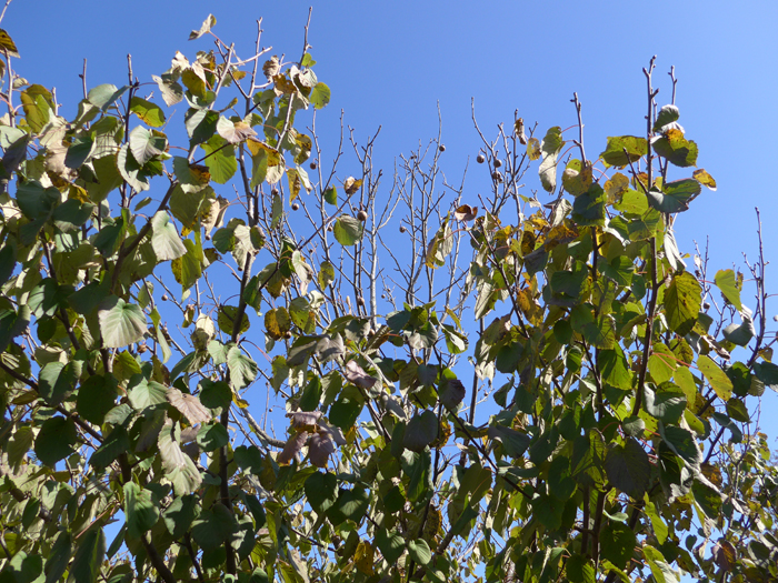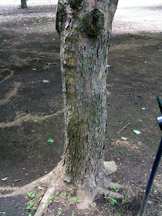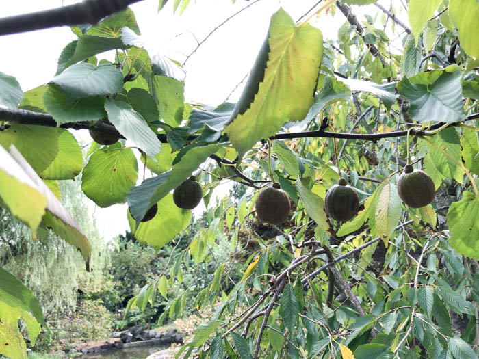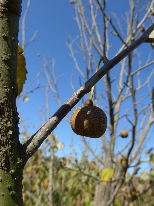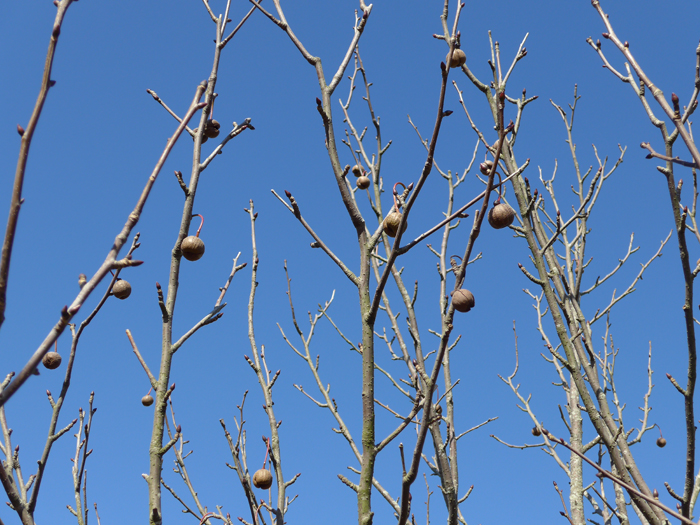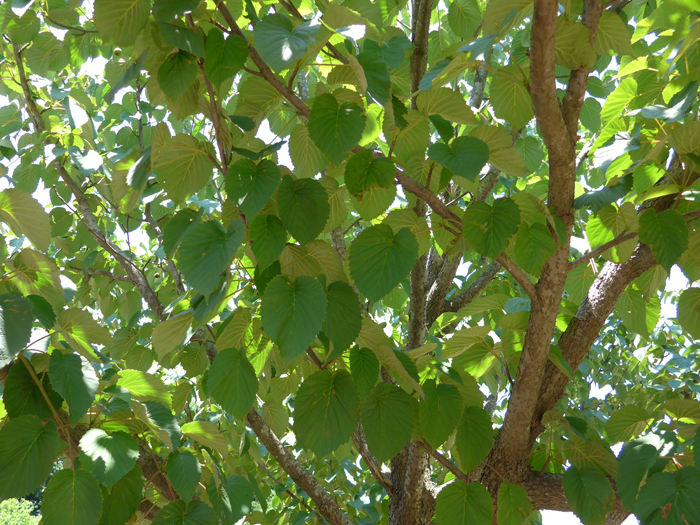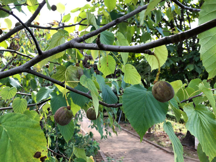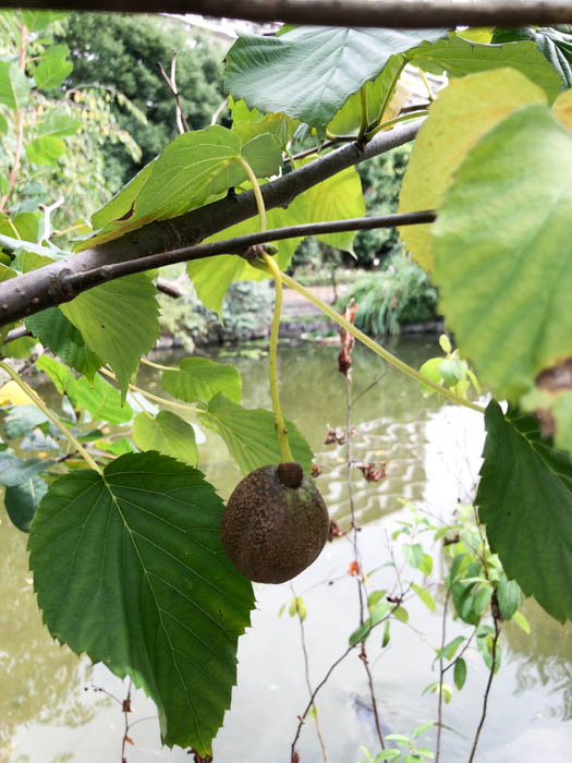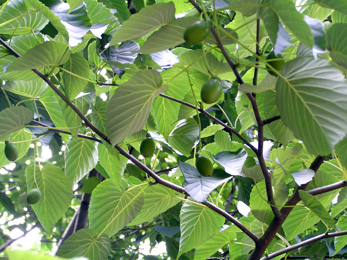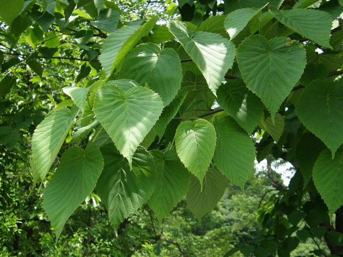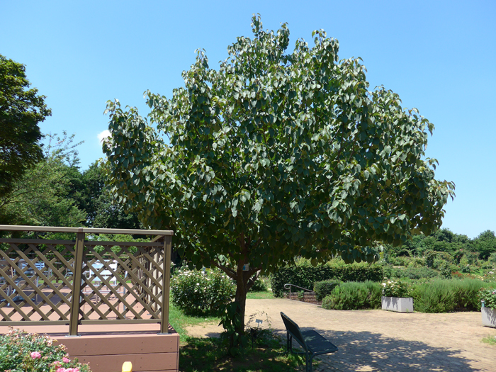 | 形態 | 主幹が立ち、整った広円錐形の樹形になる。樹皮は灰褐色で、小薄片が縦に剥がれる。葉は心形で、基部はやや重なる場合もあり、側脈が明瞭で、鋭い鋸歯がある。長枝につく葉は互生するが、短枝につく葉は束生状につく。4~5月頃、大きさの違う2枚の白い苞葉に挟まれ、球形の頭状花序に1個の両性花と多数の雄花をつける。花柄は短枝の先から葉と共に束生状に出る。果実は長球形の核果で、緑色から熟して赤褐色〜茶褐色になる。 |