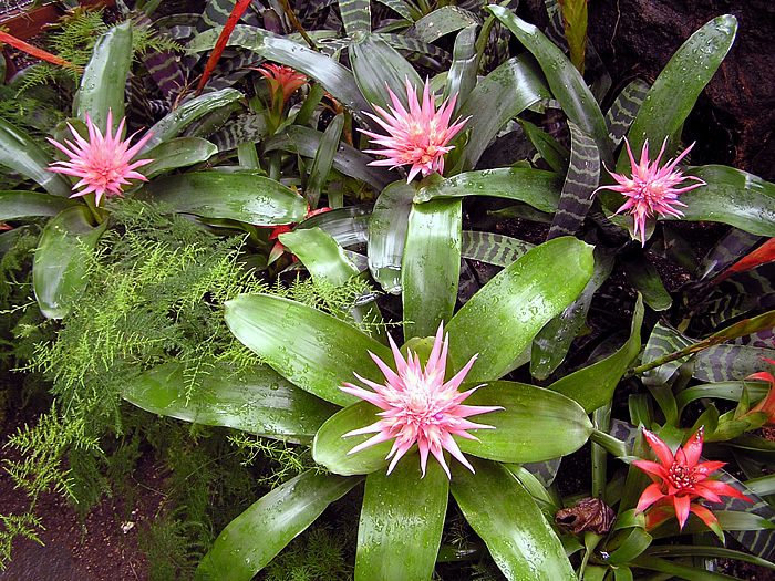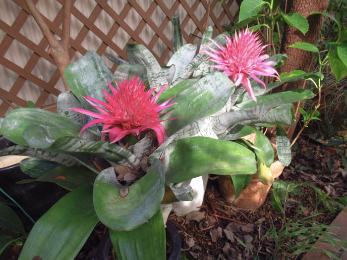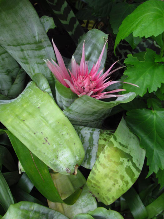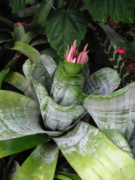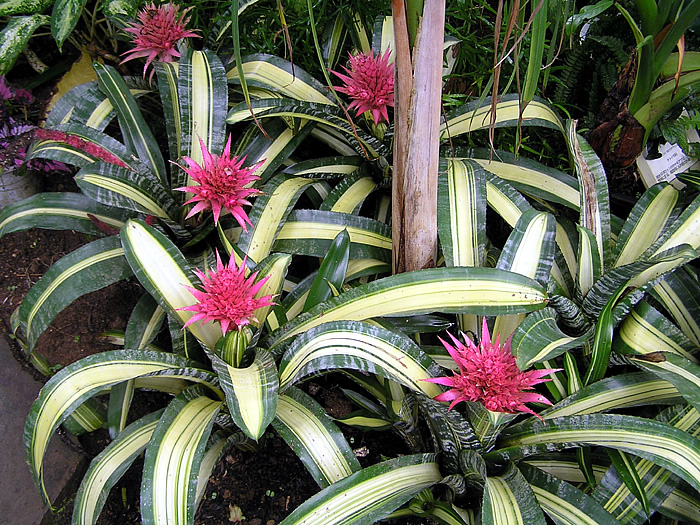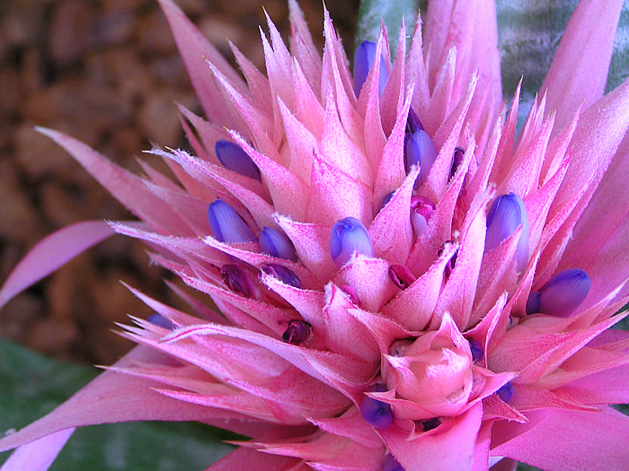| 形態 | 樹木や岩に着生、または地上に根を張る。剣状で硬質の葉が螺旋状につきロゼット状の株になり、株の中心部や葉と葉の間に水を溜め、そこから養水分を吸収して育つ。葉には細かな棘状の鋸歯があり、葉色は灰青緑色で、白っぽく粉を吹いたようなトリコームの横縞虎斑模様が入る。14~16時間の日長で開花が促進される長日植物で、南半球の原産地では12月~翌3月頃、日本では5〜9月頃、ロゼットの中心から花茎を伸ばし、茎頂に桃色の花苞を松かさ状に連ねた広円錐形の花序を作り、苞の中から淡紫色の花を咲かせる。花はすぼまったままで平開せず、3日程の寿命だが、苞は数ヶ月色褪せない。 |