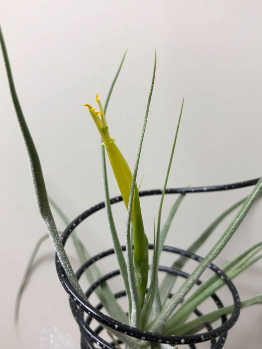 | 形態 | サボテンや岩に着生し、葉から養水分を吸収して育つ。細長くややうねりがある葉が放射状に出て、全体が不揃いな半球形になる。葉は薄緑色で銀灰色のトリコームに覆われ、肉厚で細長いが、基部はやや幅広くなって、内側に丸まる。株の中心から花茎を伸ばし、先端に花序を作り、赤や黄色の苞の中から、黄色の筒状の花を咲かせる。 |