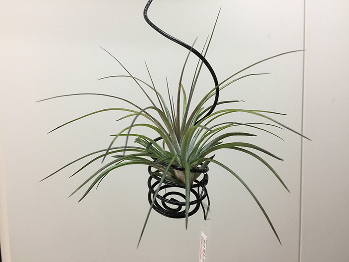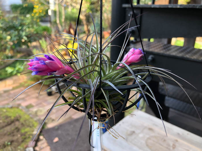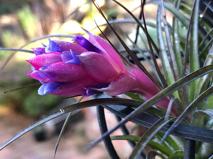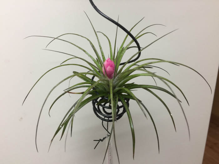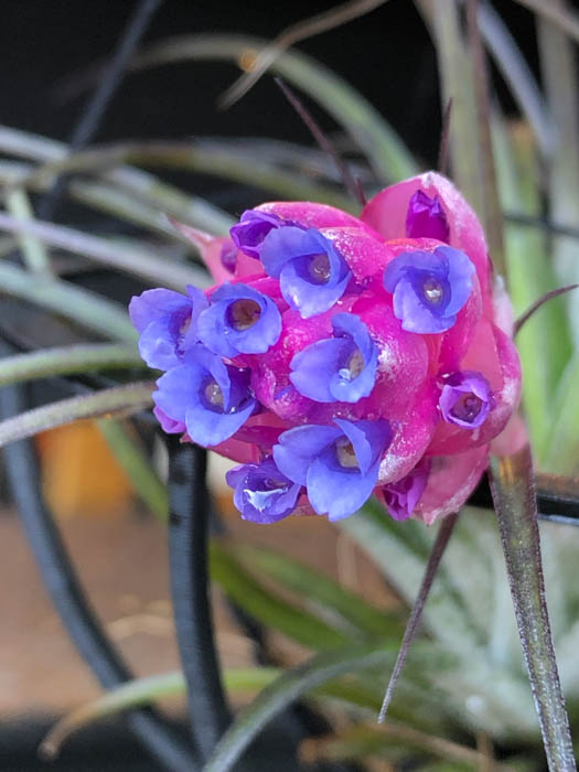 | 形態 | 樹木や岩に着生し、葉から養水分を吸収して育つ。細長い葉がやや直立ぎみに出て、全体は幅広い箒のようになる。葉は薄緑色で銀灰色のトリコームに覆われ、肉厚で細長いが、基部はやや幅広くなって、内側に丸まる。株の中心から花茎を伸ばし、先端に花序を作り、鮮やかなピンクの苞の中から、紫色の3弁花を咲かせる。 |