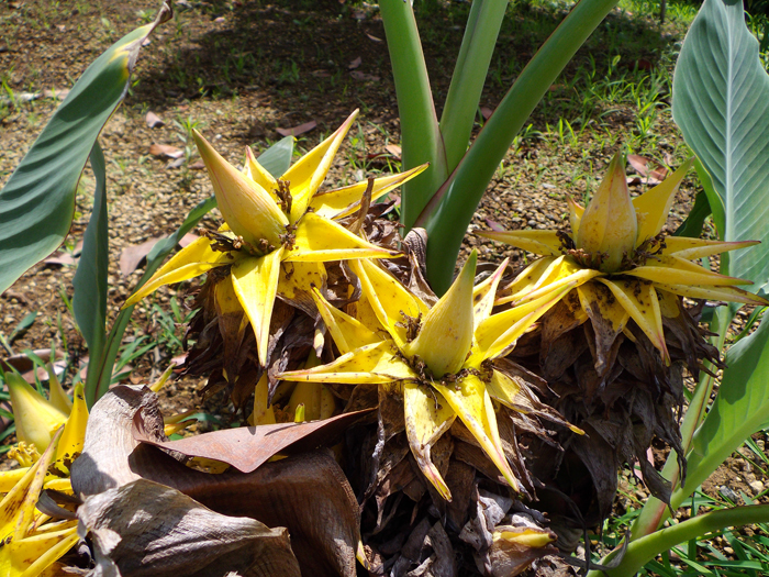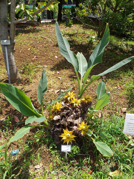 | 形態 | 葉鞘が重なり合った偽茎が直立する。葉は大型の楕円形。春~秋にかけて、偽茎の先端に黄色い苞葉を何枚も重ね、苞葉の間に同色の筒状の花を上向きに咲かせる。開花期間は長く、200日を越える。果実は偽果で中に小さな種子が入る。 |