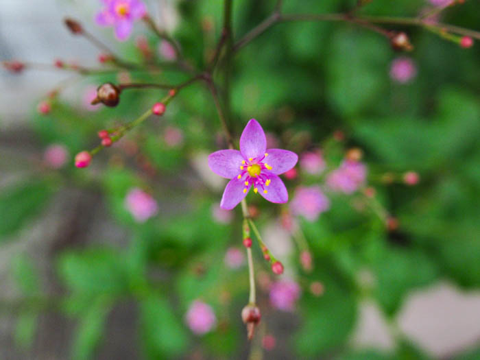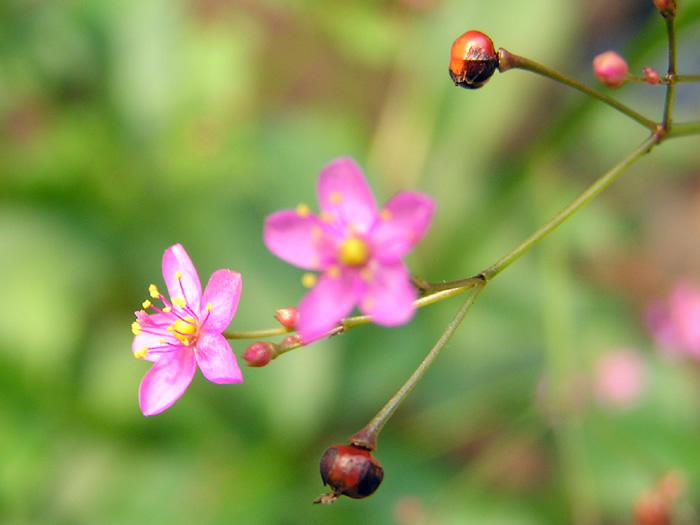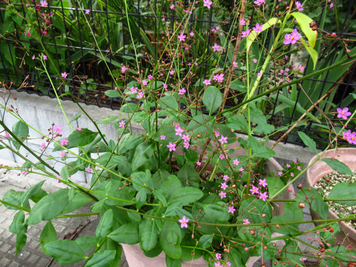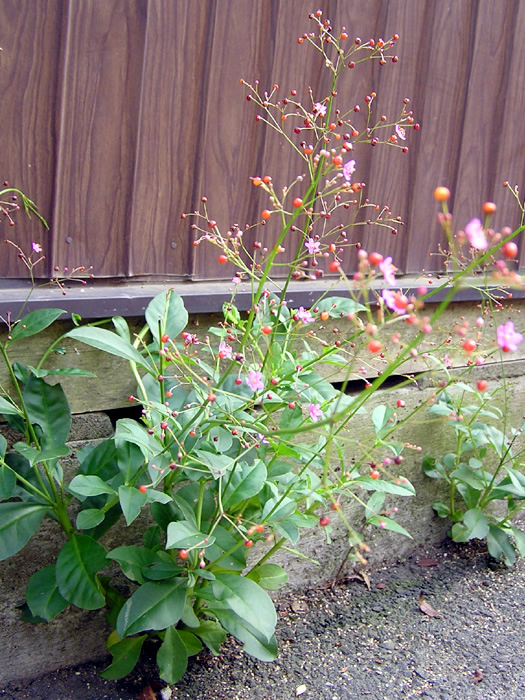 | 形態 | 茎は直立し、株元からも茎の途中からも分枝する。葉は先が尖った楕円形〜倒卵形で、互生する。6~9月頃、花茎を長く延ばし、円錐花序を作り、ピンクで5弁の花をまばらに咲かせる。花は5弁で、晴れた日の午後3時頃〜夕方にかけてのみ開く一日花。花後赤い球形の果実ができる。 |